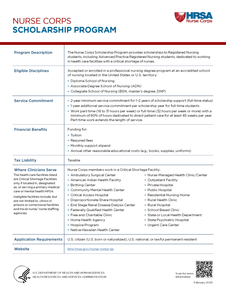 The Nurse Corps Scholarship Program through the Health Resources & Services Administration (HRSA) helps nursing students (ADN, BSN, and graduate) fund their education while preparing them to make a difference in communities facing critical nurse shortages.